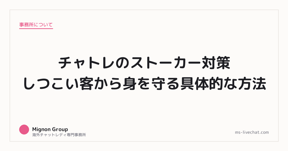チャトレは正当な仕事だし、法律的にも事務所の風営法届出で守られている。でも社会的な偏見はまだあるから、バレるリスクは可能な限り低くしておくに越したことはない。安全に配信できる環境を整えるのは、事務所の仕事の1つだ。うちの事務所では、在籍者のストーカー対策を一緒に確認して、足りない対策があれば具体的に提案している。