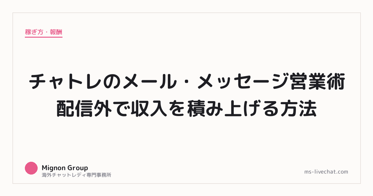 メール・メッセージ営業は地味だけど、配信の収入を安定させるために欠かせない活動だ。配信時間を増やさなくても、営業の質を上げるだけで月収が変わる。配信後のお礼メッセージ、配信前の告知、写真付きメッセージ。この3つを習慣にするだけで、常連の維持率と新規獲得率が目に見えて上がる。