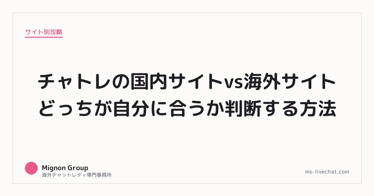 国内サイトと海外サイトの選択は、チャトレとしてのキャリアの方向性を決める重要な判断だ。でも一度決めたら変えられないわけではない。国内で始めて半年後に海外に移る人もいるし、海外でやっていた人が国内に戻ることもある。どちらを選んでも経験は無駄にならない。国内で磨いた会話力は海外サイトでも活きるし、海外で培ったパフォーマンス力は国内サイトでも差別化になる。最初の選択を恐れすぎずに、まず始めてみてほしい。
