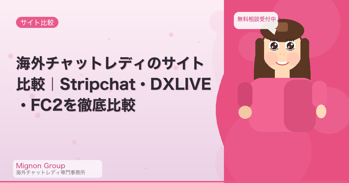 海外チャットレディ専門事務所。Stripchat・DXLIVE・FC2ラブチップ・FANZAライブ対応。風営法届出済み・源泉徴収対応。在宅完全対応、報酬率最大80%、面接なし・配信ノルマなし。LINEサポート(15時〜翌3時)で配信の悩みに即レスで対応しています。