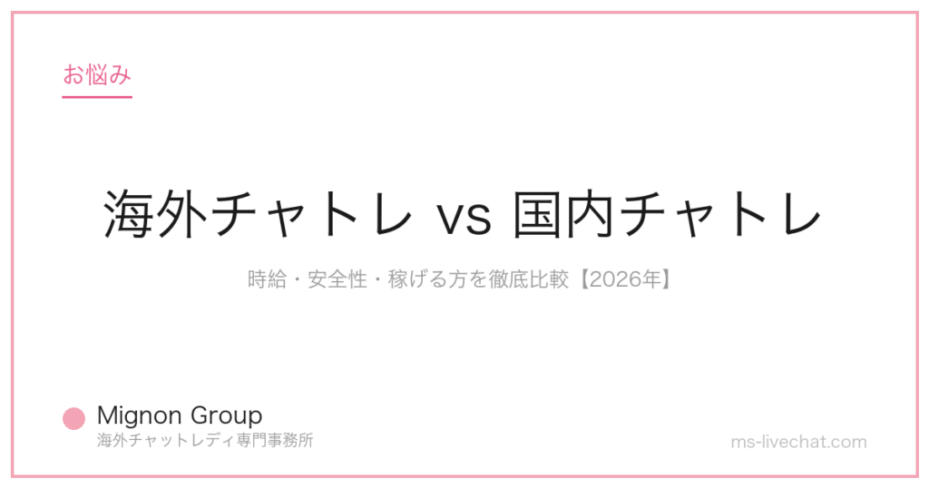 海外チャトレと国内チャトレを時給・安全性・身バレリスク・安定性の4軸で徹底比較。どっちが自分に向いてるかタイプ別判断、月収別のおすすめ戦略、ハイブリッド運用まで【2026年】 -