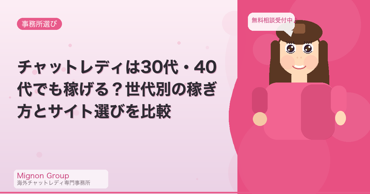 会話力が常連につながる。 チャットレディで安定して稼いでいる人の共通点は「常連がいること」。30代以降は人生経験から話の幅が広く、男性客の悩みに共感できる力がある。これは20代には真似しにくい武器になる。