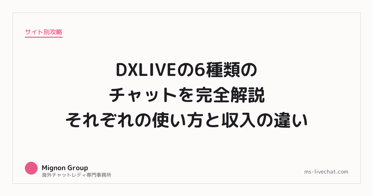 DXLIVEには6種類のチャットがある。それぞれ課金の仕組みも単価も違う。これを知らないまま配信を始める人が結構多いけど、どのチャットをどう使うかで収入が倍以上変わることもある。知らないだけで損をしている人が多い。事務所で何人もの配信者を見てきた経験から、それぞれの仕組みと収入の違い、そして実際にどう組み合わせて使えば効率よく稼げるのかを書いていく。