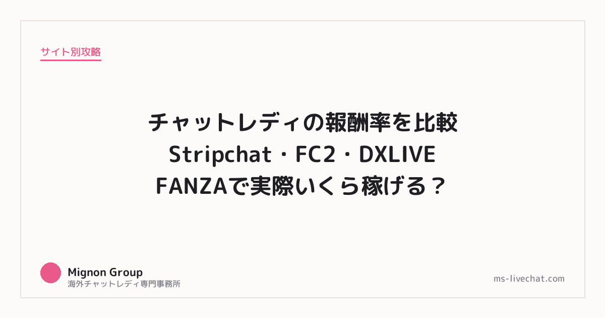 Mignon Groupは海外サイト(Stripchat・DXLIVE・FC2ラブチップ)に特化した事務所です。個人登録や国内サイトと比べて、こんなメリットがあります。